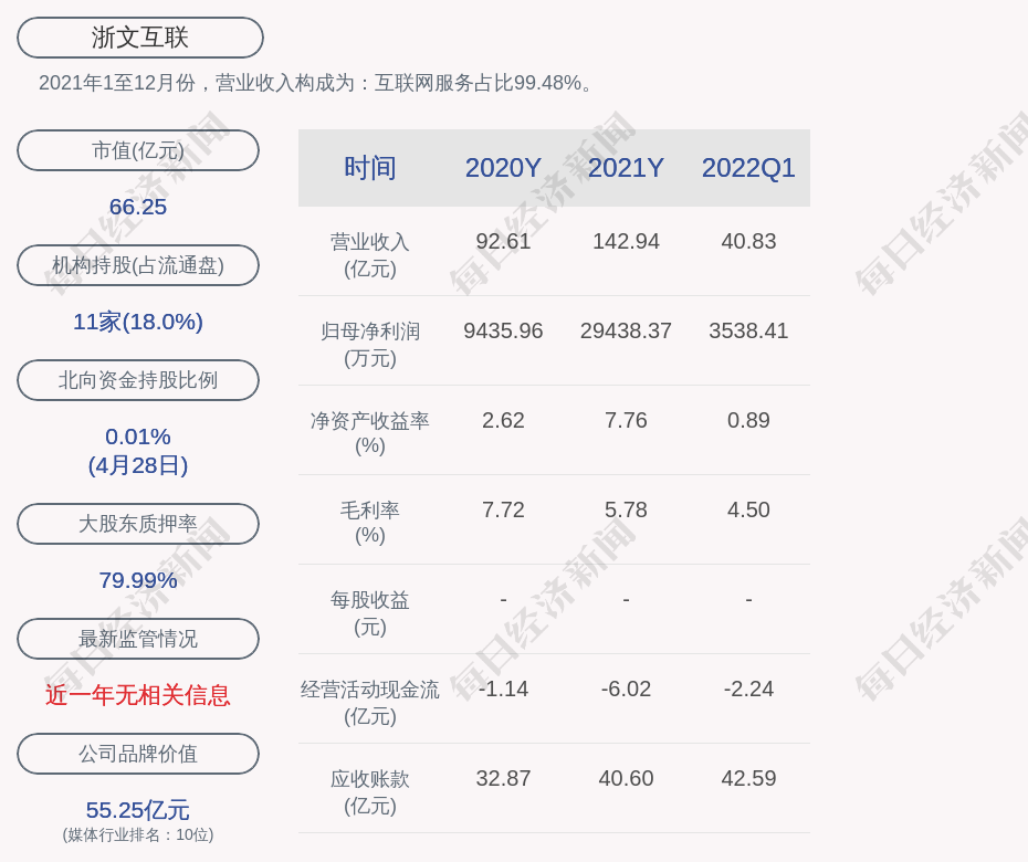 2021年1至12月份,浙文互联的营业收入构成为:互联网服务占比99.48%。