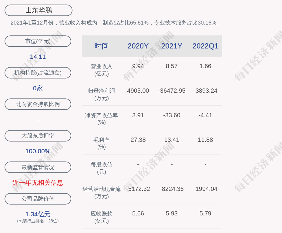 2021年1至12月份,山东华鹏的营业收入构成为:制造业占比65.81%,专业技术服务占比30.16%。