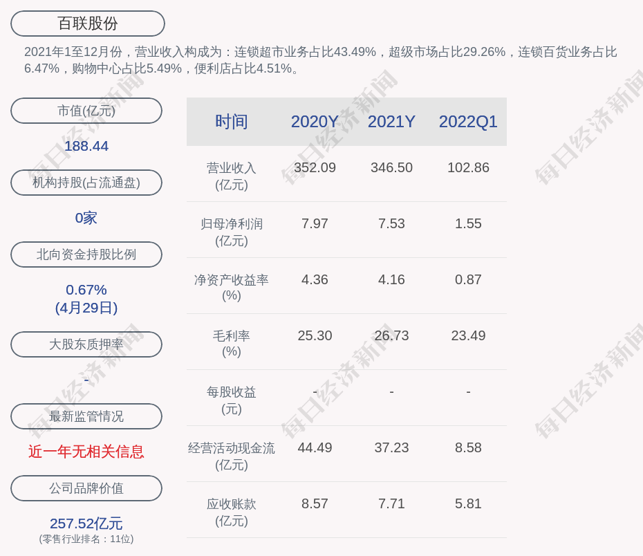2021年1至12月份,百联股份的营业收入构成为:连锁超市业务占比43.49%,超级市场占比29.26%,连锁百货业务占比6.47%,购物中心占比5.49%,便利店占比4.51%。