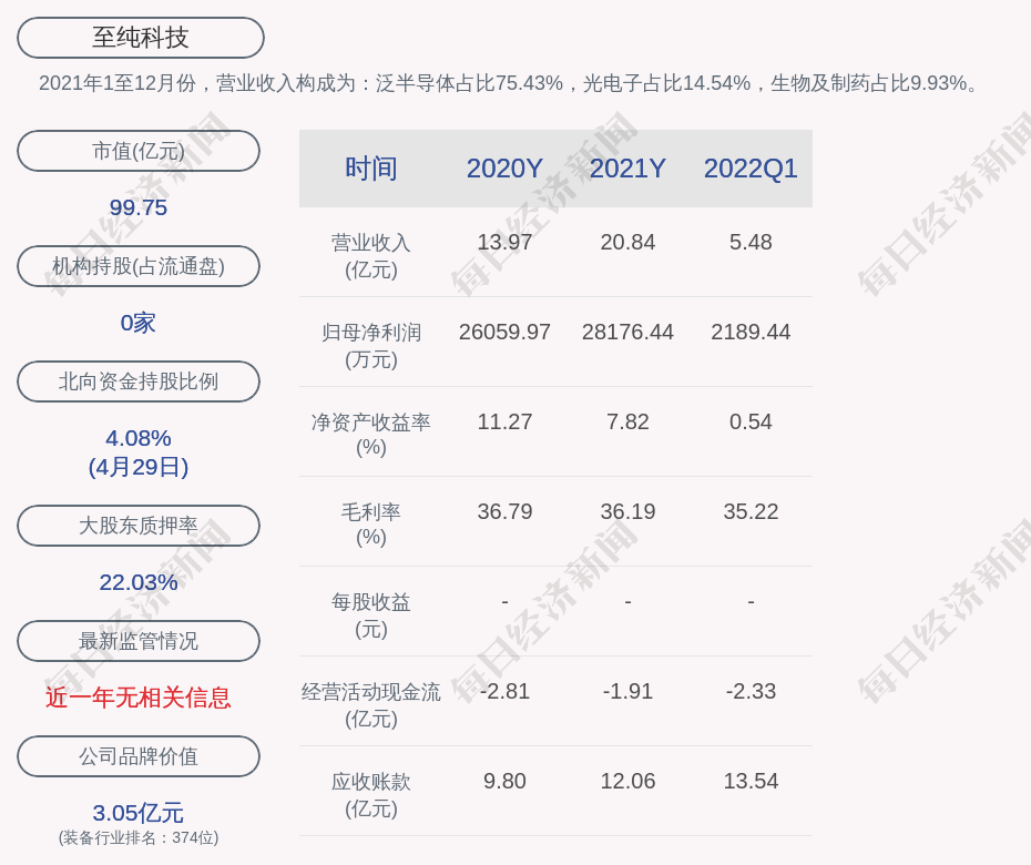每经AI快讯,至纯科技(SH 603690,收盘价:31.32元)4月30日发布一季度业绩公告称,2022年第一季度营收约5.48亿元;归属于上市公司股东的净利润约2189万元;基本每股收益0.069元。