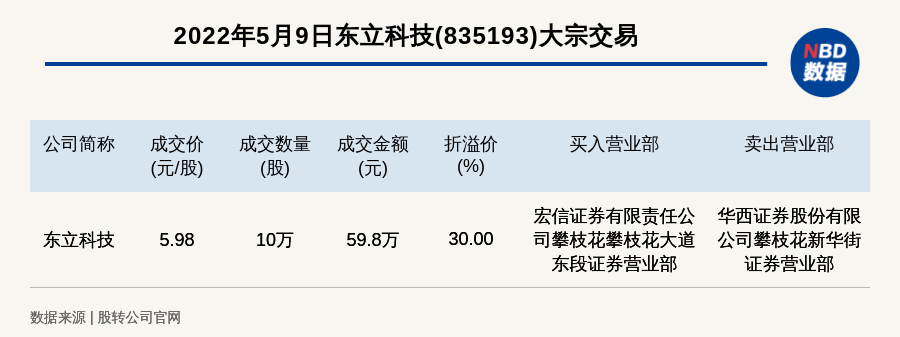 每经讯,2022年5月9日,新三板创新层公司东立科技(835193)发生一笔大宗交易,成交价5.98元/股,成交数量10万股,成交金额59.8万元,溢价30%。买入营业部是宏信证券有限责任公司攀枝花攀枝花大道东段证券营业部,卖出营业部是华西证券股份有限公司攀枝花新华街证券营业部。