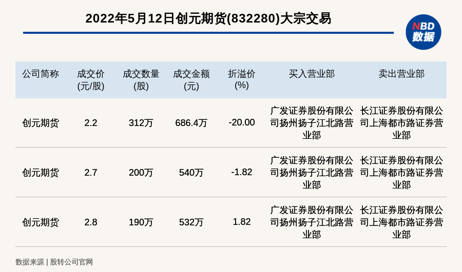 每经讯,2022年5月12日,新三板创新层公司创元期货(832280)发生3笔大宗交易,总成交金额为1758.4万元,成交金额最高的一笔成交价2.2元/股,成交数量312万股,成交金额686.4万元,折价20%。买入营业部是广发证券股份有限公司扬州扬子江北路营业部,卖出营业部是长江证券股份有限公司上海都市路证券营业部。