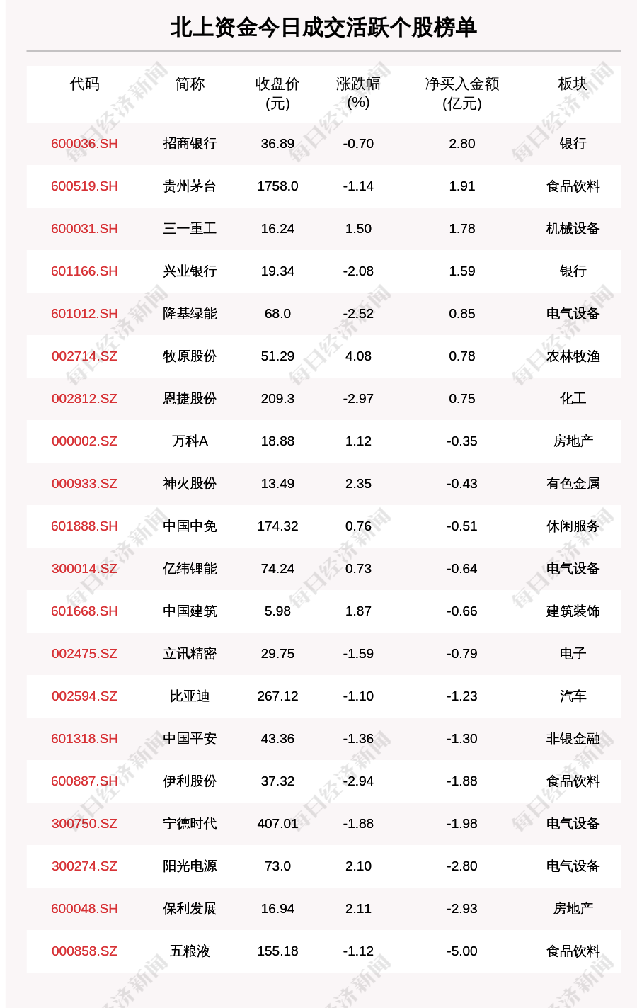 5月16日,北上资金成交活跃个股榜单中,净买入个股共7只,金额最多的是招商银行(600036.SH,收盘价:36.89元),净买入2.796亿元;净卖出个股共13只,金额最多的是五粮液(000858.SZ,收盘价:155.18元),净卖出5.000亿元。