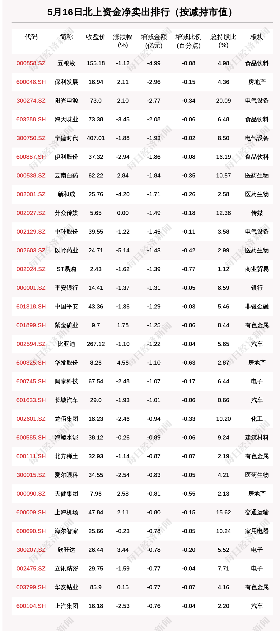 5月16日,按照北向资金减持市值排序,五粮液(000858.SZ,收盘价:155.18元)减持市值最大,减持市值4.986亿元,环比减少1.62%。其他北上资金减持市值较多的个股还包括保利发展(600048.SH,收盘价:16.94元)、阳光电源(300274.SZ,收盘价:73.0元)、海天味业(603288.SH,收盘价:73.38元)。