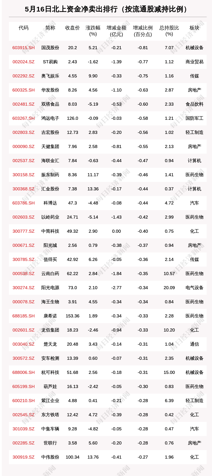 每经AI快讯,5月16日,北上资金净卖出的个股共有926只,北上资金减仓比例超1%的有790只。其中,国茂股份(603915.SH,收盘价:20.2元)减仓比例最为明显,最新持股比例7.07%,环比减少0.81个百分点。其他北上资金减仓比例较多的个股还包括ST易购(002024.SZ,收盘价:2.43元)、奥飞娱乐(002292.SZ,收盘价:4.55元)、华发股份(600325.SH,收盘价:8.26元)。