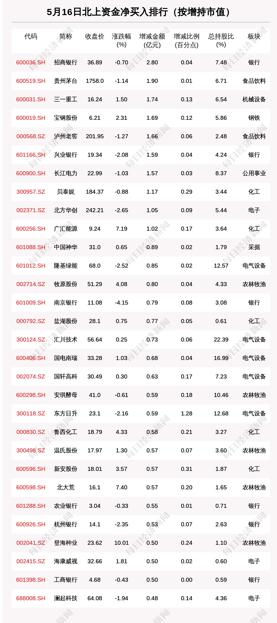 5月16日,按照北向资金增持市值排序,招商银行(600036.SH,收盘价:36.89元)增持市值最大,增持市值2.799亿元,环比增加0.49%。其他北上资金增持市值较多的个股还包括贵州茅台(600519.SH,收盘价:1758.0元)、三一重工(600031.SH,收盘价:16.24元)、宝钢股份(600019.SH,收盘价:6.21元)。