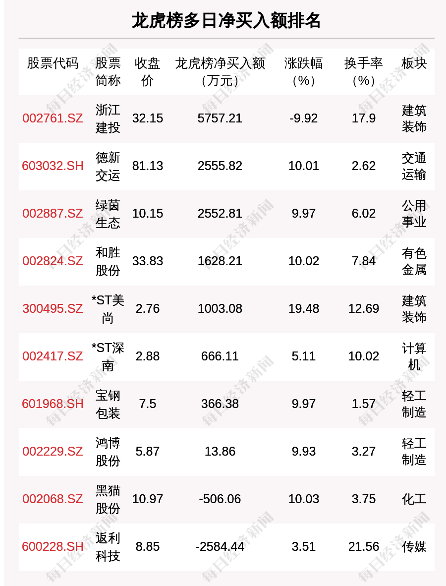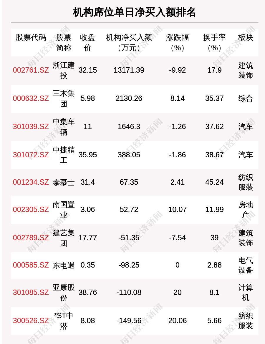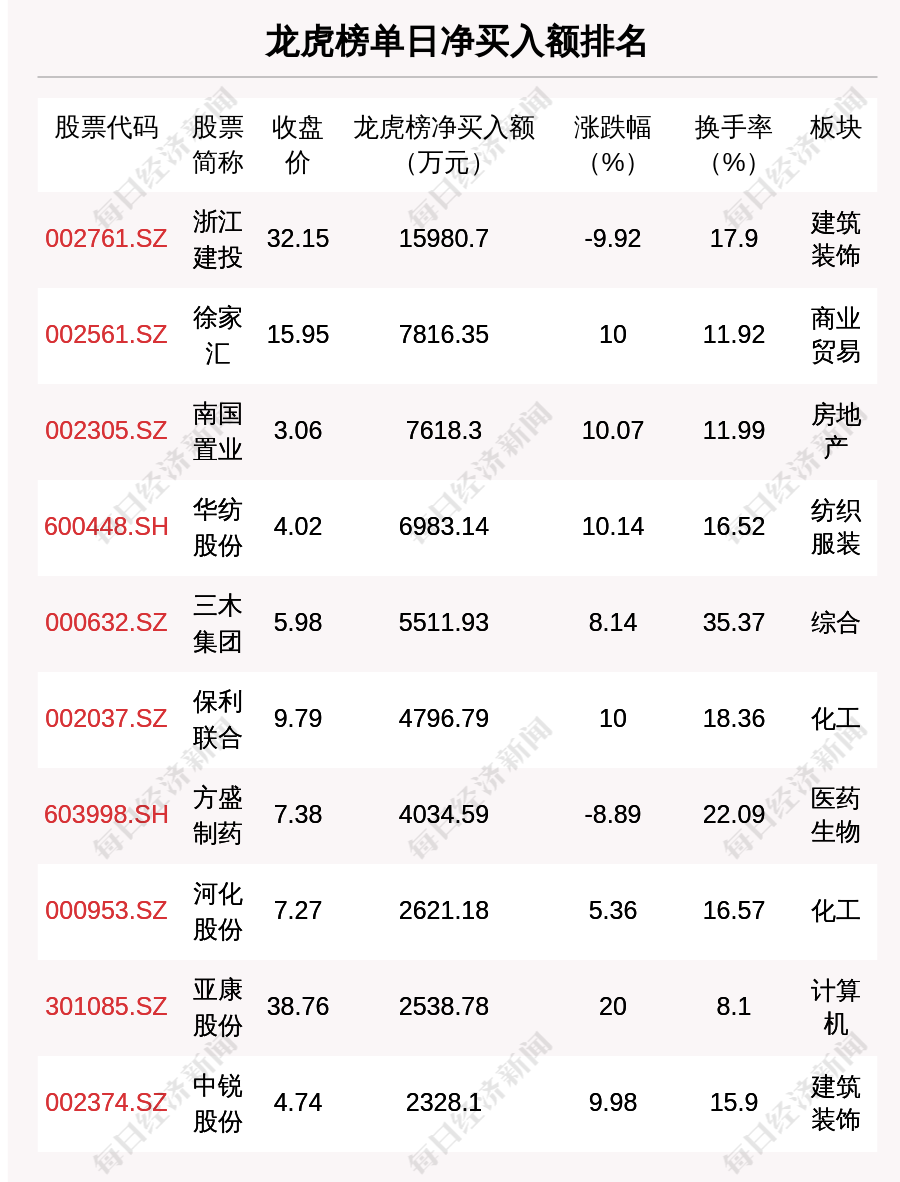 在龙虎榜中,涉及机构专用席位的个股有20只,净买入额前三的是浙江建投、三木集团、中集车辆,分别为1.32亿元、2130.26万元、1646.3万元。