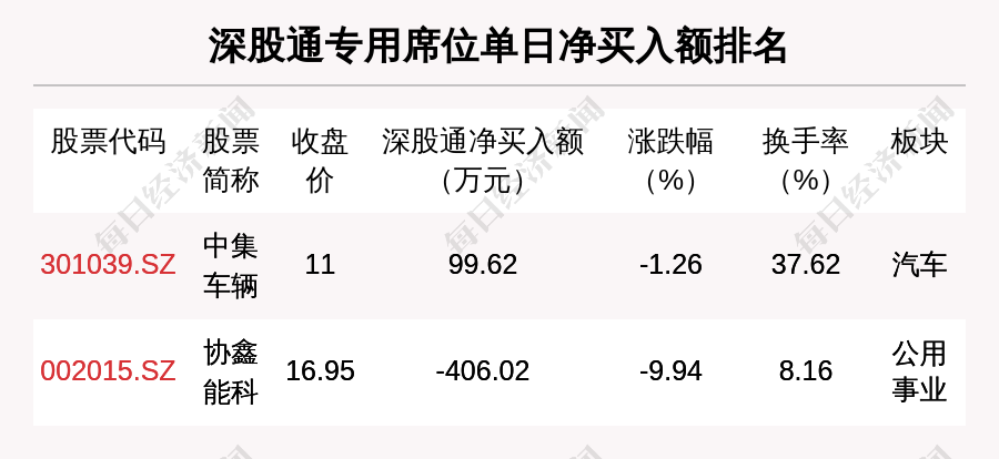 在龙虎榜中,涉及深股通专用席位的个股有2只,中集车辆的深股通专用席位净买入额最大,净买入99.62万元。