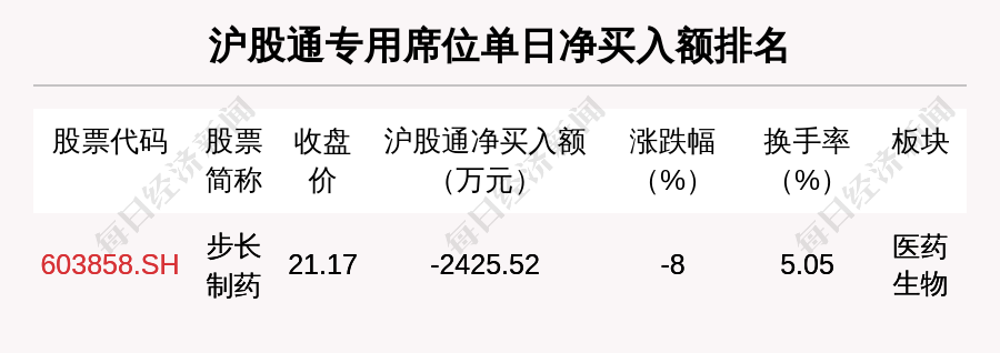 在龙虎榜中,涉及沪股通专用席位的个股有1只,步长制药的沪股通专用席位净卖出额最大,净卖出2425.52万元。