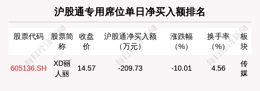 在龙虎榜中,涉及沪股通专用席位的个股有1只,XD丽人丽的沪股通专用席位净卖出额最大,净卖出209.73万元。