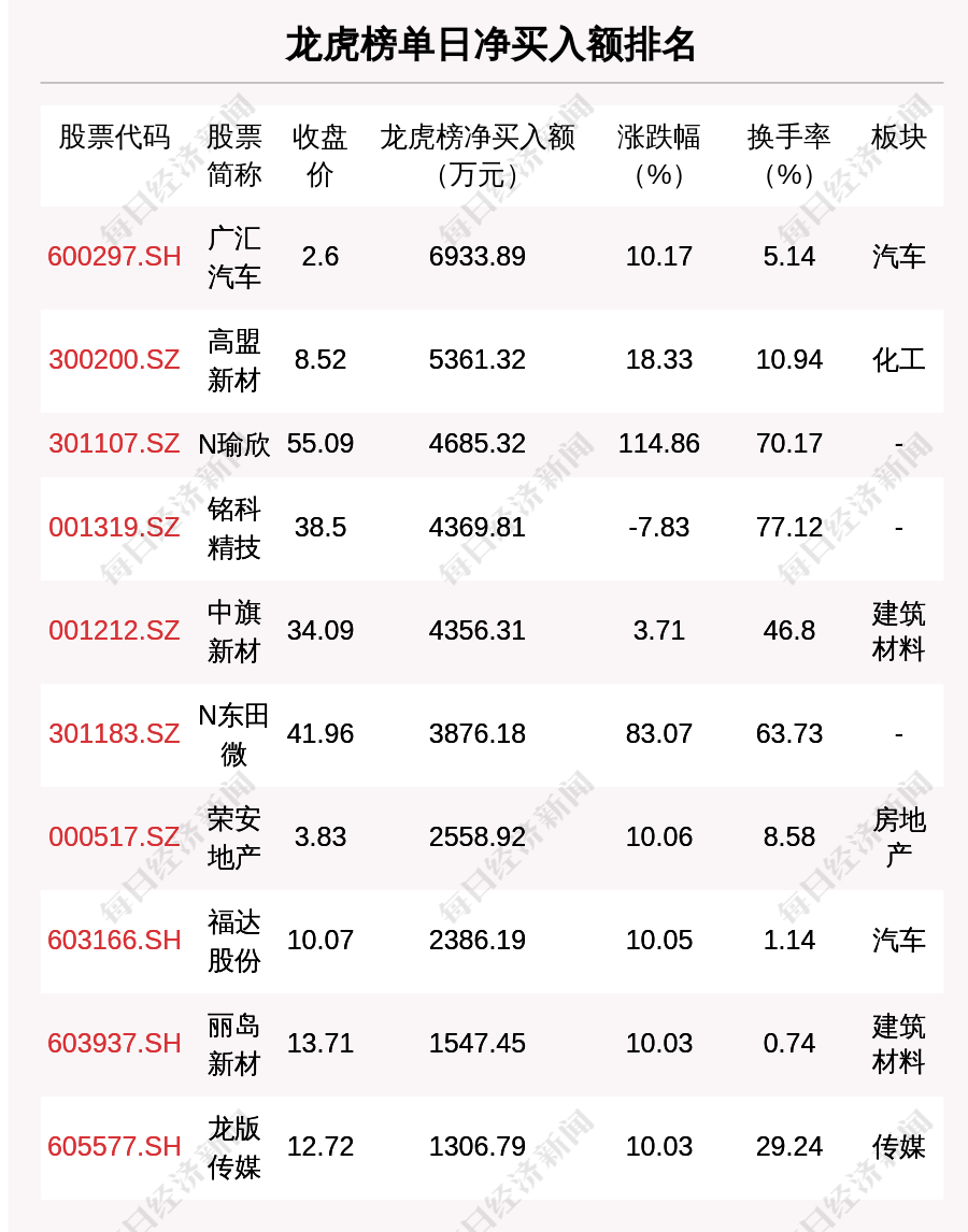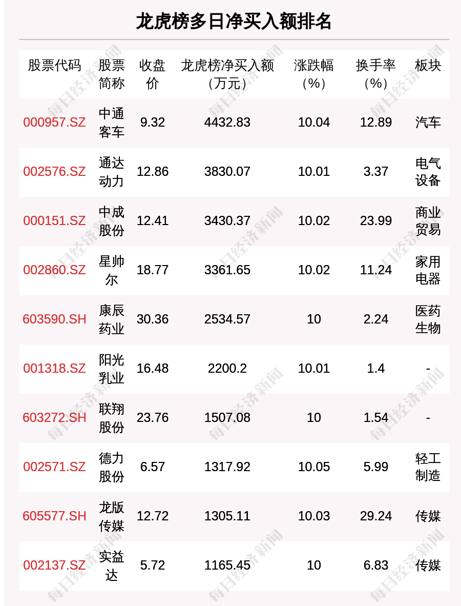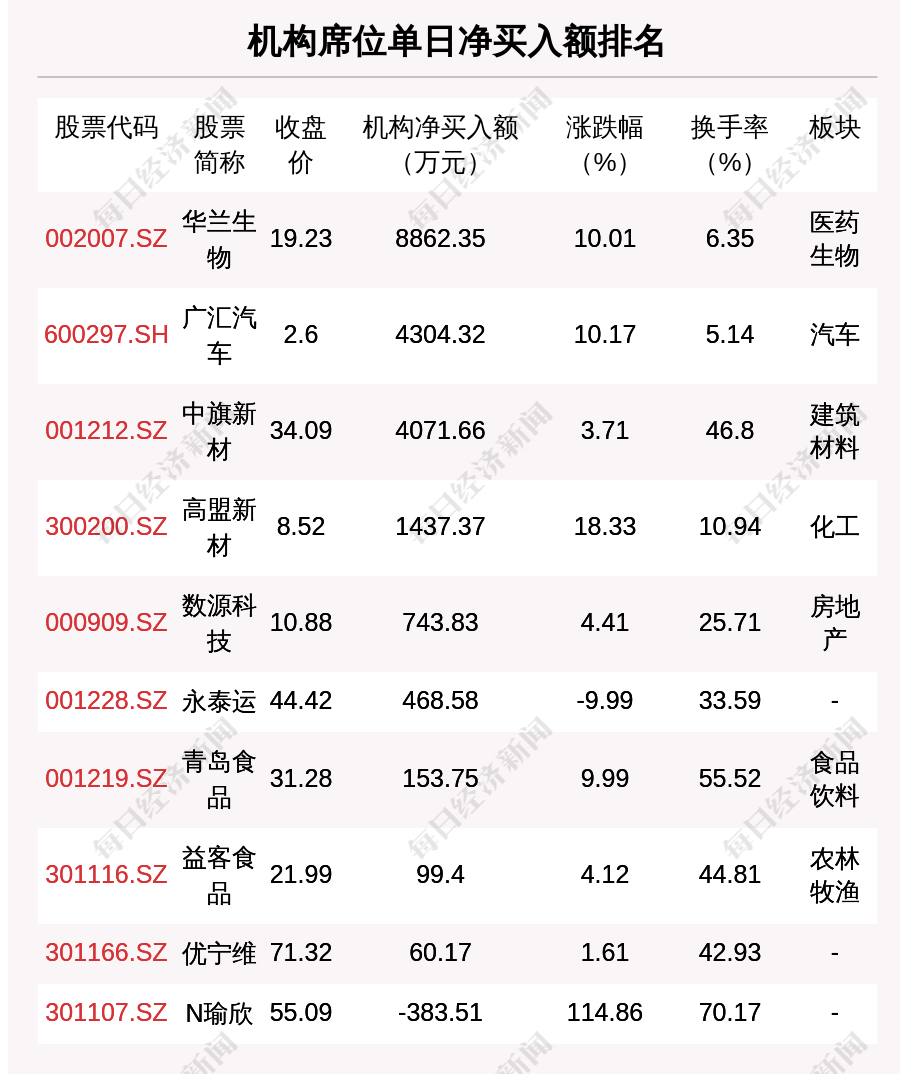 在龙虎榜中,涉及机构专用席位的个股有18只,净买入额前三的是华兰生物、广汇汽车、中旗新材,分别为8862.35万元、4304.32万元、4071.66万元。