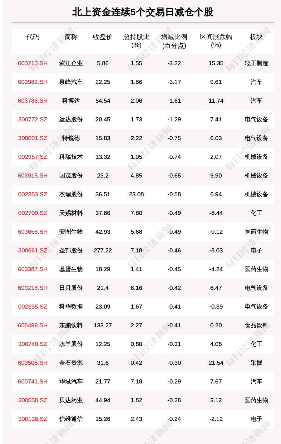 每经AI快讯,5月26日,北上资金连续5个交易日卖出36个股。北上资金连续5个交易日减仓个股中,紫江企业(600210.SH,收盘价:5.86元)减持比例增幅最大,5个交易日减持3.22百分点,其他跌幅较大的个股包括泉峰汽车(603982.SH,收盘价:22.25元)、科博达(603786.SH,收盘价:54.54元)、运达股份(300772.SZ,收盘价:20.45元),分别减持3.17个百分点、1.61个百分点、1.29个百分点。