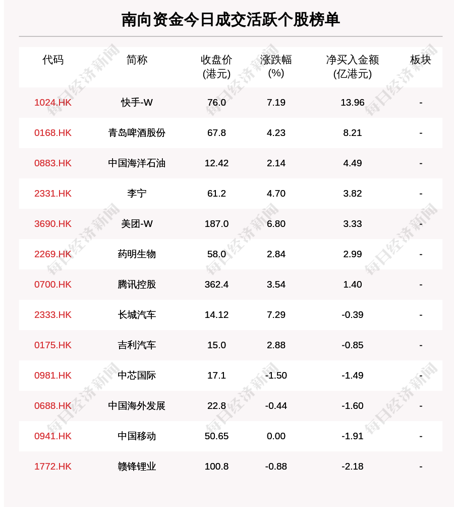南向资金成交活跃个股榜单中,净买入个股共7只,金额最多的是快手-W(1024.HK,收盘价:76.0港元),净买入13.958亿港元;净卖出个股共6只,金额最多的是赣锋锂业(1772.HK,收盘价:100.8港元),净卖出2.177亿港元。