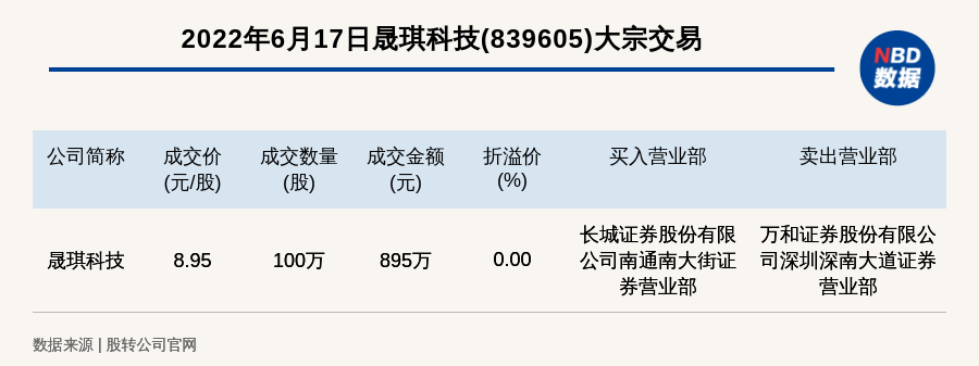 每经讯,2022年6月17日,新三板创新层公司晟琪科技(839605)发生一笔大宗交易,成交价8.95元/股,成交数量100万股,成交金额895万元,为平价交易。买入营业部是长城证券股份有限公司南通南大街证券营业部,卖出营业部是万和证券股份有限公司深圳深南大道证券营业部。