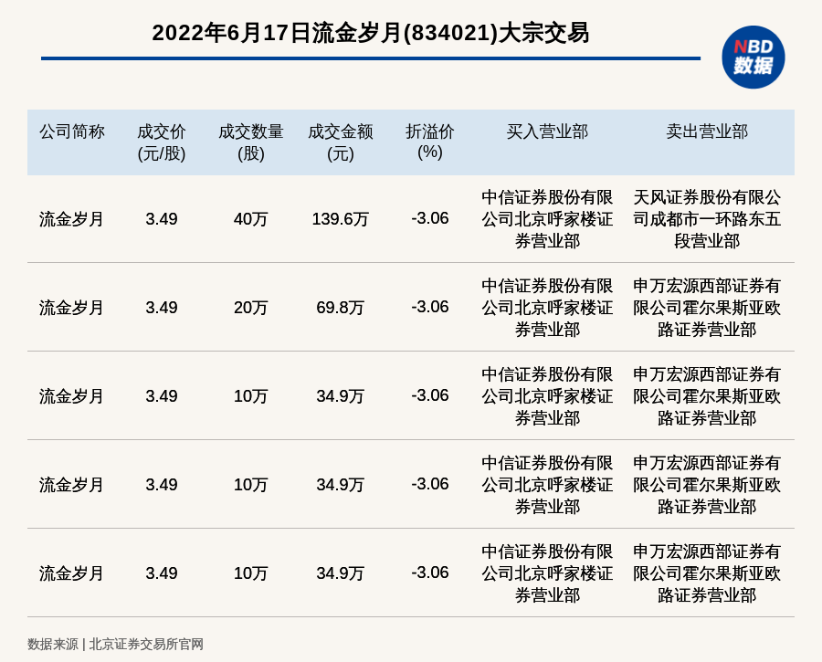 每经讯,2022年6月17日,北交所上市公司流金岁月(834021)发生5笔大宗交易,总成交金额为314.1万元,成交金额最高的一笔成交价3.49元/股,成交数量40万股,成交金额139.6万元,折价3.06%。买入营业部是中信证券股份有限公司北京呼家楼证券营业部,卖出营业部是天风证券股份有限公司成都市一环路东五段营业部。