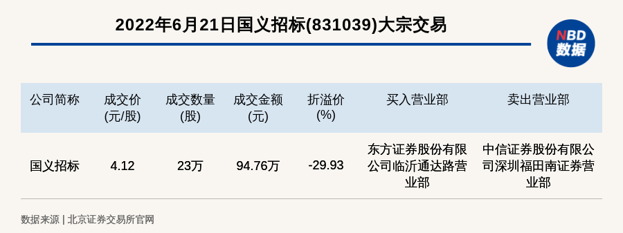 每经讯,2022年6月21日,北交所上市公司国义招标(831039)发生一笔大宗交易,成交价4.12元/股,成交数量23万股,成交金额94.76万元,折价29.93%。买入营业部是东方证券股份有限公司临沂通达路营业部,卖出营业部是中信证券股份有限公司深圳福田南证券营业部。
