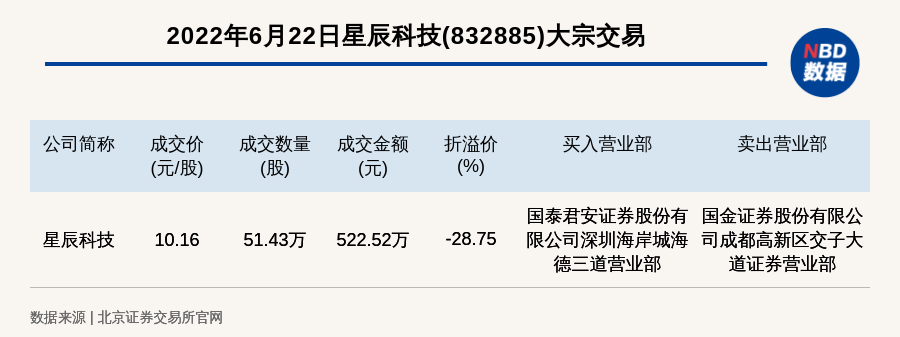 每经讯,2022年6月22日,北交所上市公司星辰科技(832885)发生一笔大宗交易,成交价10.16元/股,成交数量51.43万股,成交金额522.52万元,折价28.75%。买入营业部是国泰君安证券股份有限公司深圳海岸城海德三道营业部,卖出营业部是国金证券股份有限公司成都高新区交子大道证券营业部。