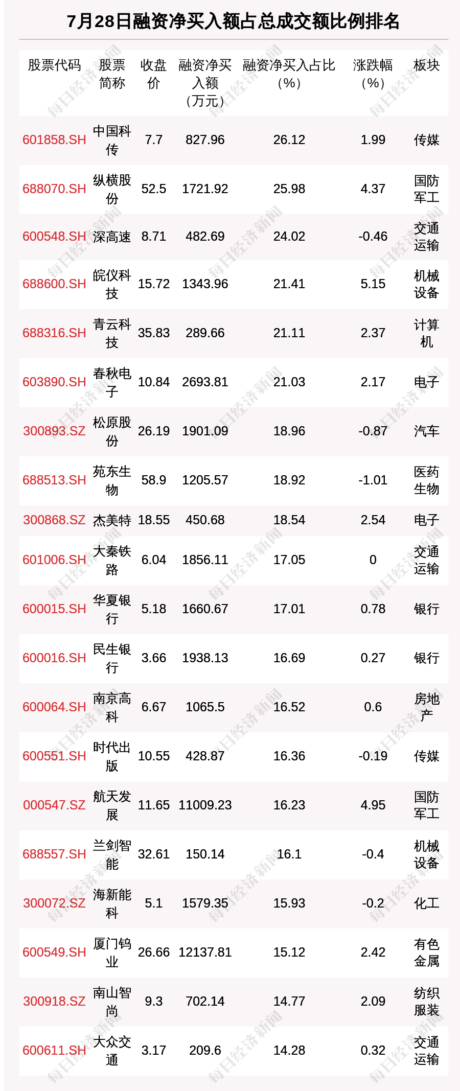 7月28日两市共有1083只个股有融资资金净买入。共有45只股票融资净买入额占总成交金额比例超10%,其中中国科传、纵横股份、深高速排名前三,占比分别为26.12%、25.98%、24.02%。