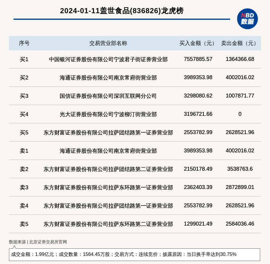 每经讯,2024年1月11日,北交所上市公司盖世食品(836826,收盘价:12.4元)登上龙虎榜,交易方式是连续竞价,披露原因是当日换手率达到30.75%,成交数量1564.45万股,成交金额1.99亿元。买一席位为中国银河证券股份有限公司宁波君子街证券营业部,买入755.79万元;卖一席位为海通证券股份有限公司南京常府街营业部,卖出400.2万元。