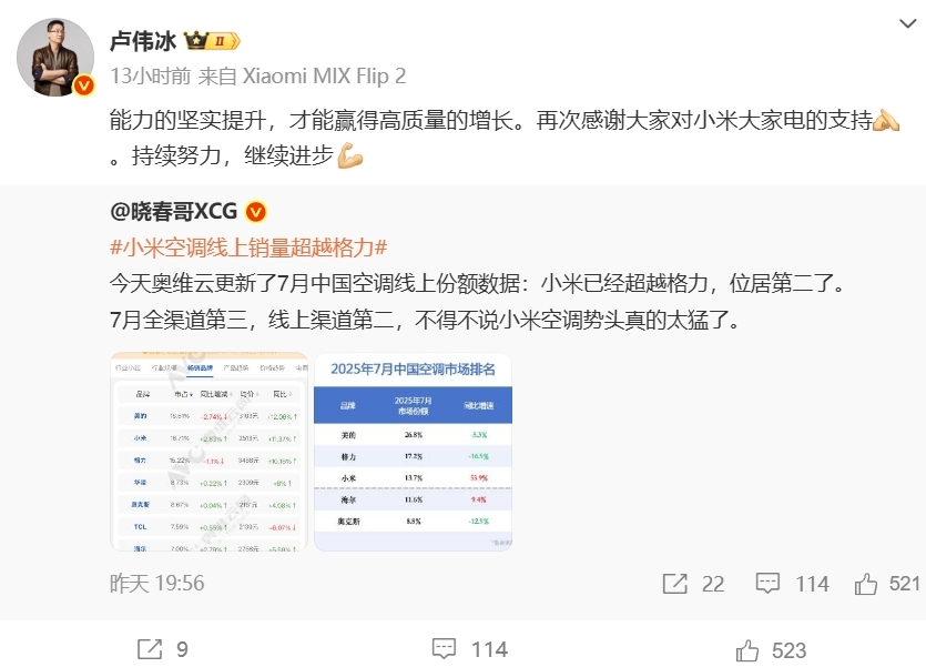 对此,小米集团合伙人、总裁,手机部总裁,小米品牌总经理卢伟冰8月16日发文表示:“能力的坚实提升,才能赢得高质量的增长。再次感谢大家对小米大家电的支持。持续努力,继续进步”。