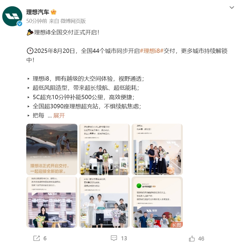 8月20日,理想汽车发文称,理想i8全国交付正式开启,2025年8月20日,全国44个城市同步开启交付,更多城市持续解锁中。