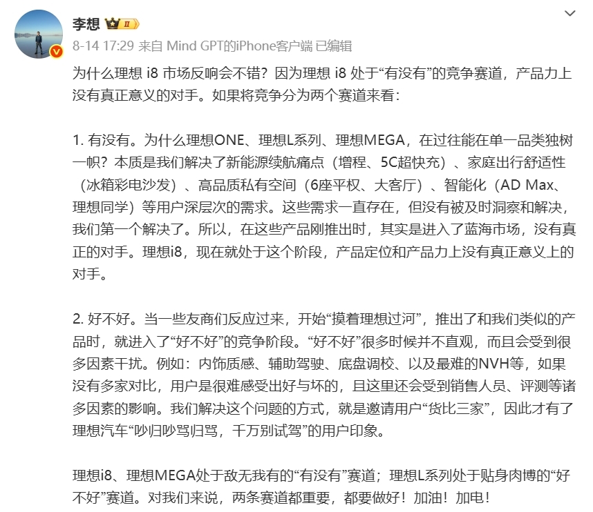 8月14日,李想又发文称,为什么理想 i8 市场反响会不错?因为理想 i8 处于“有没有”的竞争赛道,产品力上没有真正意义的对手。