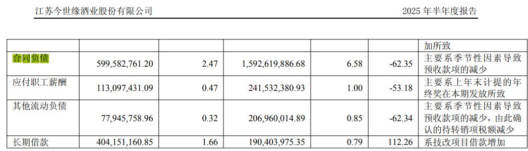 另外值得注意的是,今年上半年,今世缘的合同负债约为6亿元,相较于2024年年末减少62.35%。虽然公司称主要系季节性因素导致预收款项的减少,但这也从侧面反映出经销商打款意愿可能有所降低,市场对其产品的预期较为保守。