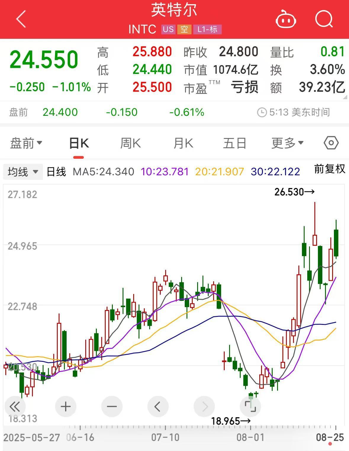 盘面上,截至美股上个交易日收盘,英特尔股价跌1.01%,报24.55美元,总市值1074.6亿美元。