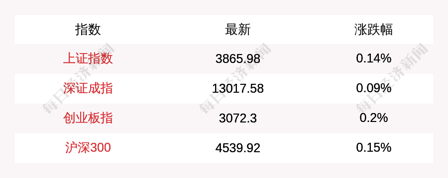 每经AI快讯:北京时间9月16日,上证指数开盘上涨5.48点,涨幅为0.14%,报3865.98点;深证成指开盘上涨11.81点,涨幅为0.09%,报13017.58点;创业板指开盘上涨6.12点,涨幅为0.2%,报3072.3点;沪深300开盘上涨6.86点,涨幅为0.15%,报4539.92点。