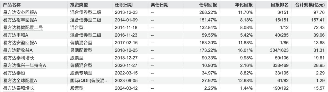 根据Wind数据,张清华目前在管的产品共有11只,管理总规模479.38亿元。作为易方达基金的名将,张清华有多只产品被业内和投资者熟知,例如他的代表作易方达安心回报A,张清华从2013年开始管理这只产品,任职回报268.22%,年化回报11.70%(截至9月29日,下同),该基金业绩排在同类产品前2%。另一只代表作易方达裕丰回报A,张清华从2014年开始管理该基金,任职回报151.47%,年化回报8.18%,基金业绩也排在同类产品前10%。此外,他管理的易方达安盈回报A等多只产品,在同类产品的回报排名名列前茅,长期来看为投资者带来了稳健回报。
