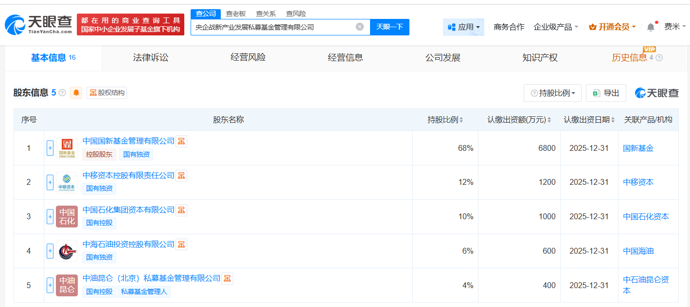 每经AI快讯,天眼查App显示,近日,央企战新产业发展私募基金管理有限公司成立,法定代表人为黄杰,注册资本1亿元人民币,经营范围为私募股权投资基金管理、创业投资基金管理服务,由中国国新基金管理有限公司、中移资本控股有限责任公司、中国石化集团资本有限公司、中海石油投资控股有限公司、中油昆仑(北京)私募基金管理有限公司共同持股。