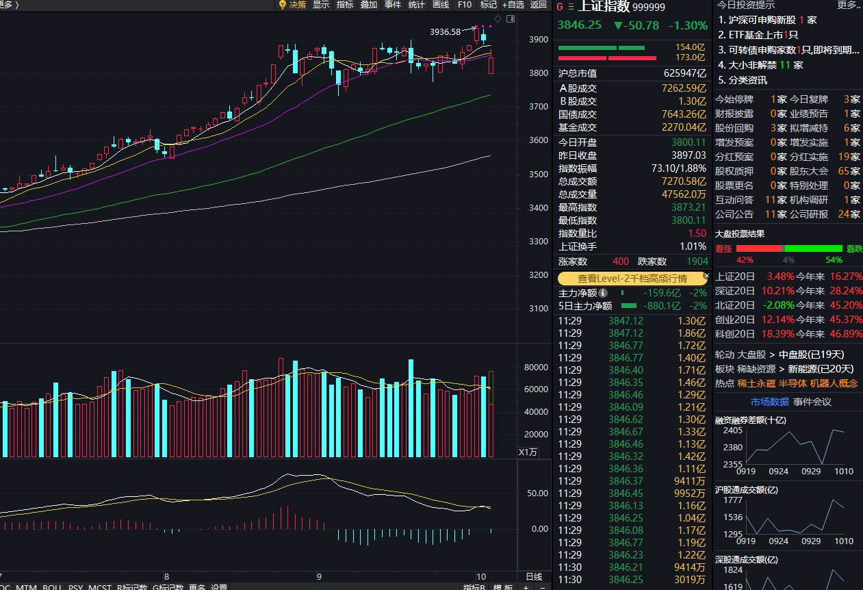 截至午间收盘,沪指下跌1.30%,报3846.25点;深成指下跌2.56%,报13013.34点;创业板指下跌3%,报3019.81点;科创50指数下跌0.43%,报1446.41点;北证50指数下跌2.43%,报1470.23点。全市场上涨个股有843家,下跌个股有4550家,46只个股涨停。两市半日合计成交15780亿元。