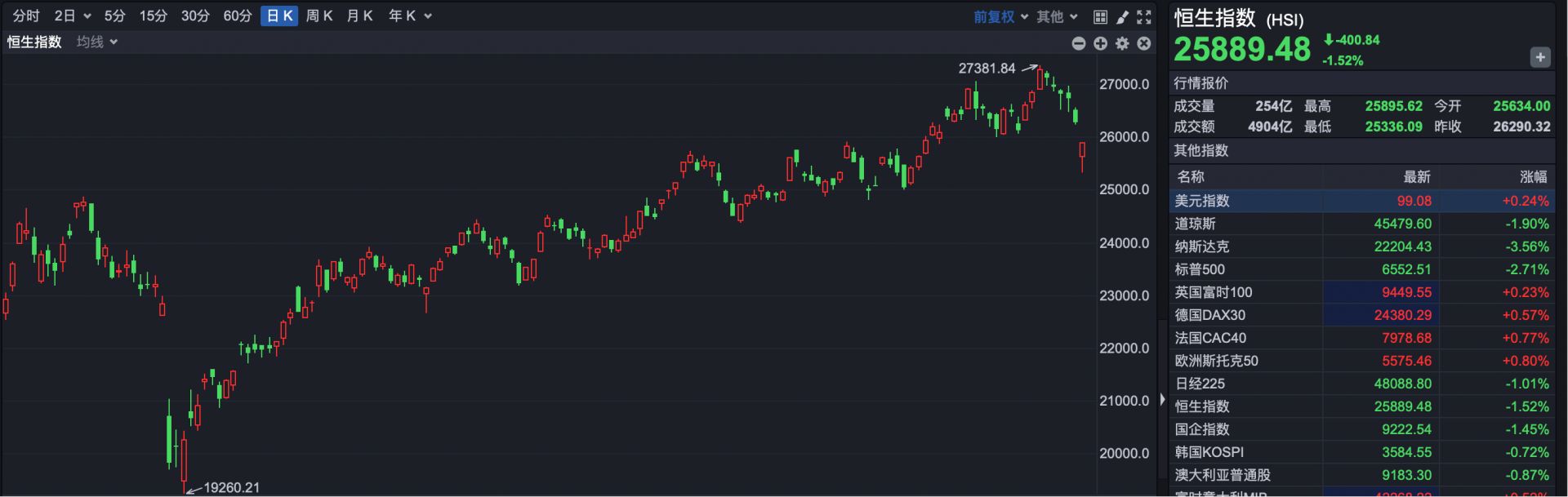 恒生指数盘中最大跌幅超3.5%,但截至收盘,恒指报收于25889.48点,下跌400.84点,跌幅1.52%。