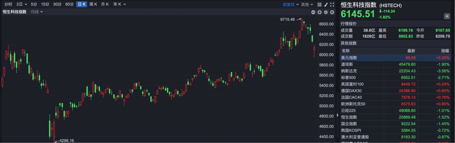 恒生科技指数盘中最大跌幅达4.90%,最终报收于6145.51点,下跌114.24点,跌幅1.82%。