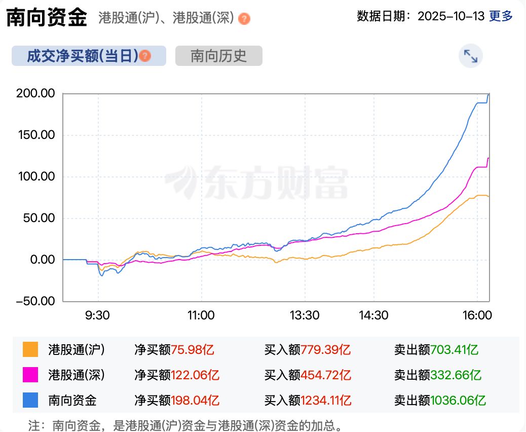今日(10月13日),港股市场迎来重要时刻,受外部因素冲击,恒指、恒生科技等重要指数大幅低开之后,尾盘跌幅明显收窄。值得注意的是,尽管指数波动显著,但南向资金逢低大举买入港股。