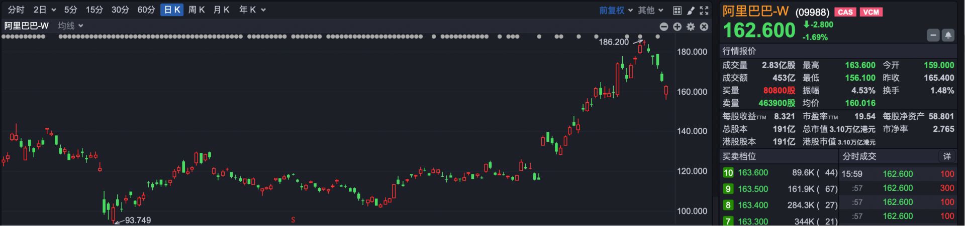 科网股表现顽强,阿里巴巴-W(09988.HK)最终下跌1.69%,全天成交453亿港元,腾讯控股(00700.HK)下跌2%,成交241亿港元。