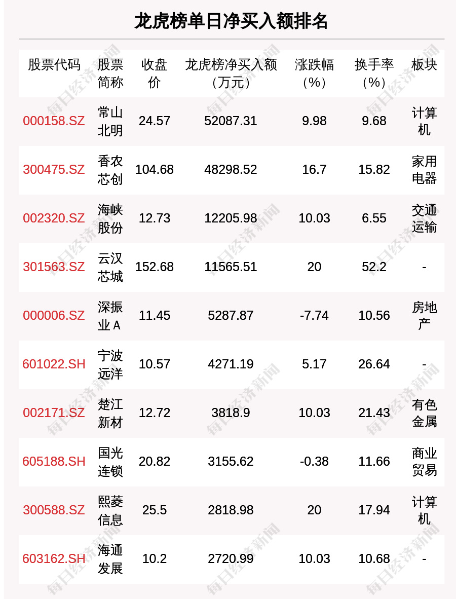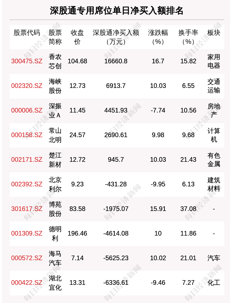 在龙虎榜中,涉及深股通专用席位的个股有10只,香农芯创的深股通专用席位净买入额最大,净买入1.67亿元。
