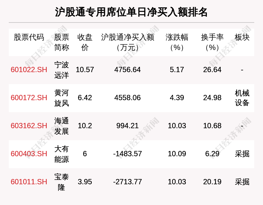 在龙虎榜中,涉及沪股通专用席位的个股有5只,宁波远洋的沪股通专用席位净买入额最大,净买入4756.64万元。