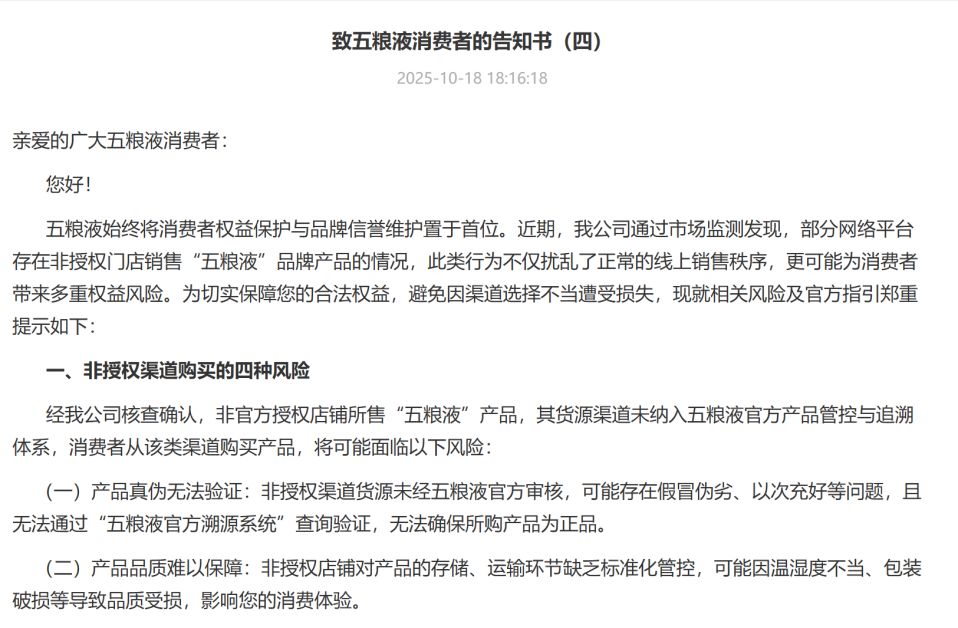 10月19日晚间,五粮液发布《致五粮液消费者的告知书(四)》称,通过市场监测发现,部分网络平台存在非授权门店销售“五粮液”品牌产品的情况,此类行为不仅扰乱了正常的线上销售秩序,更可能为消费者带来多重权益风险。