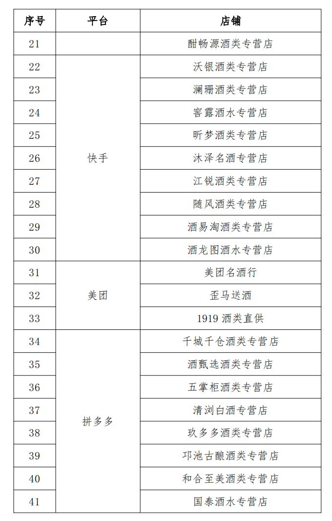 《每日经济新闻·将进酒》记者注意到,在此次五粮液公布的部分非授权店铺名单中,共有46家店铺。其中,抖音有17家,京东有4家,快手有9家,美团3家,拼多多有8家,天猫淘宝有5家。