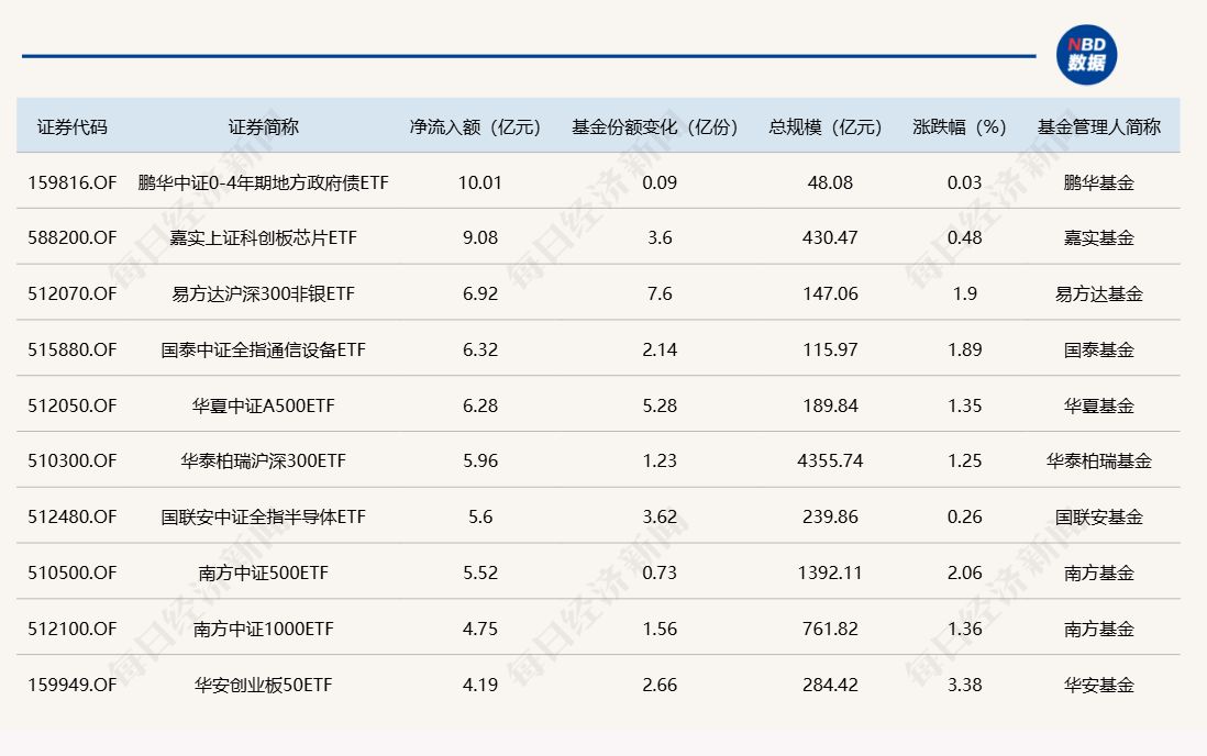 Wind数据显示,在10月29日非货币ETF市场中,鹏华中证0-4年期地方政府债ETF基金份额增加0.09亿份,净流入额为10.01亿元;嘉实上证科创板芯片ETF基金份额增加3.60亿份,净流入额为9.08亿元;易方达沪深300非银ETF基金份额增加7.60亿份,净流入额为6.92亿元。
