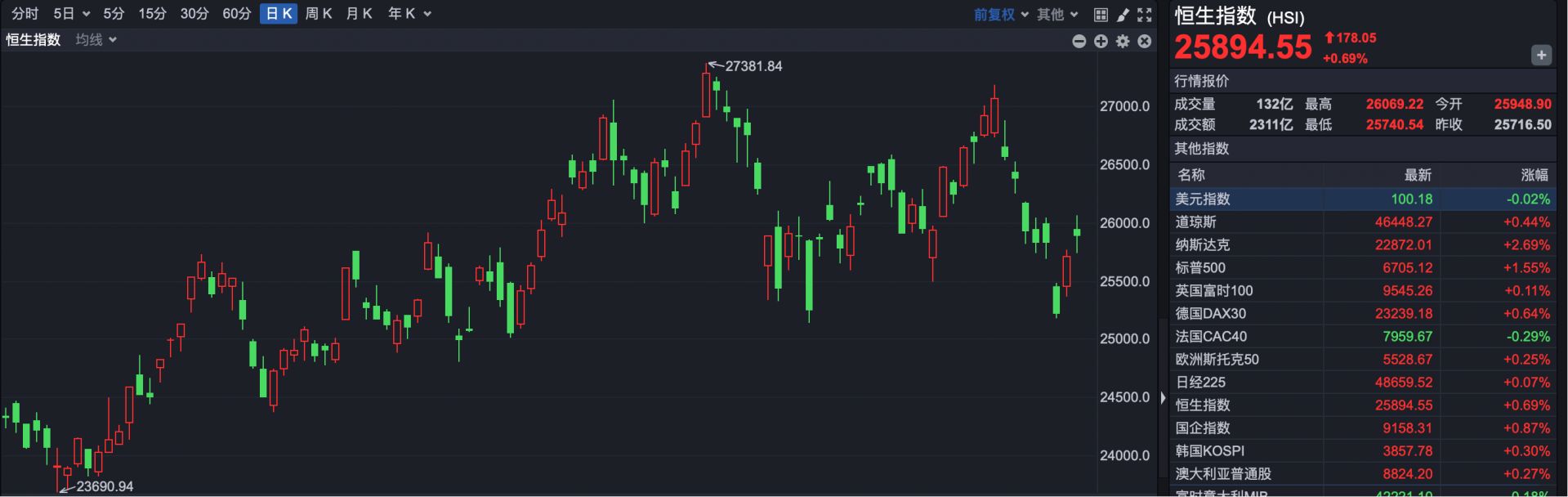 截至收盘,恒生指数报收于25894.55点,上涨178.05点,涨幅0.69%。