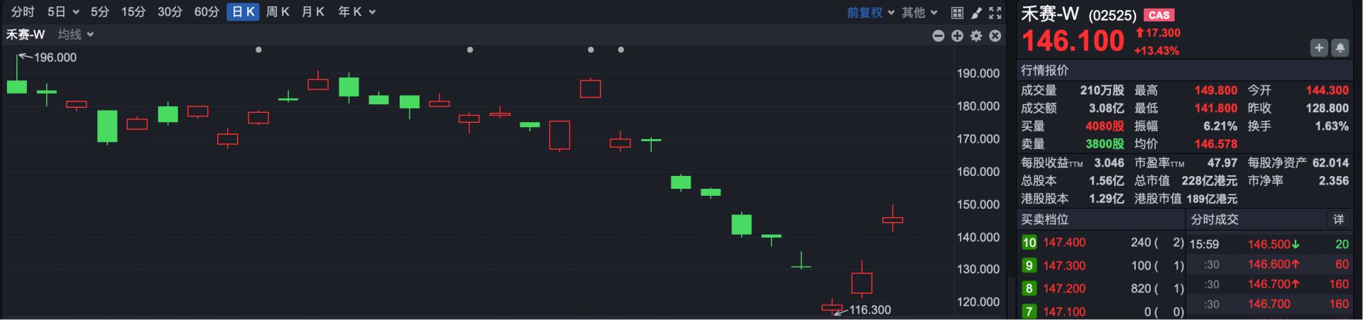 值得注意的是,除了禾赛外,另一家激光雷达企业速腾聚创也宣布,公司与滴滴自动驾驶达成新一代Robotaxi车型定点合作,单车配备激光雷达数量达到10颗。受此影响,今日速腾聚创(HK02498)小涨1%。