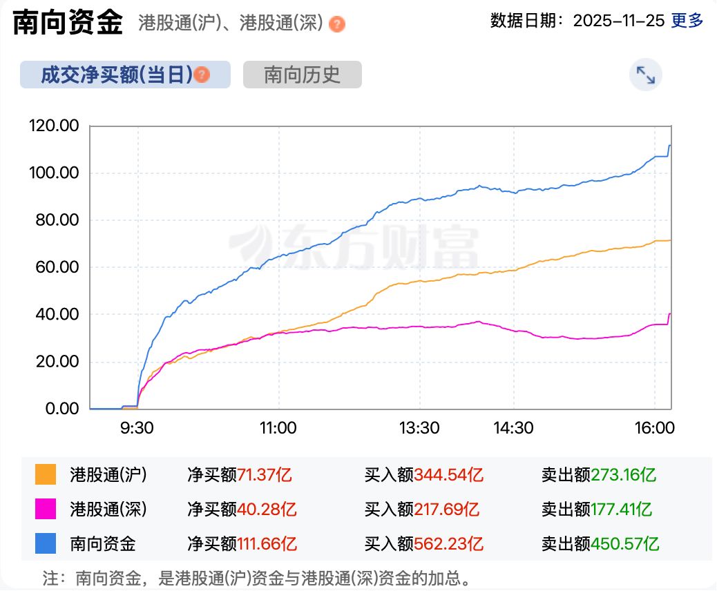 资金方面,截至收盘,南向资金累计净买入港股超111亿港元。