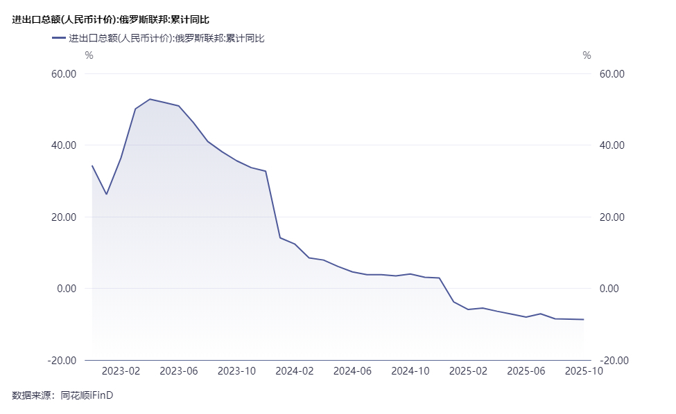 根据海关总署公布的数据,今年前10个月,我国对俄罗斯进出口规模1.31万亿元人民币,同比下滑8.7%,其中,出口5878.8亿元人民币,同比下降11.9%;进口7249.8亿元,同比下降5.9%。