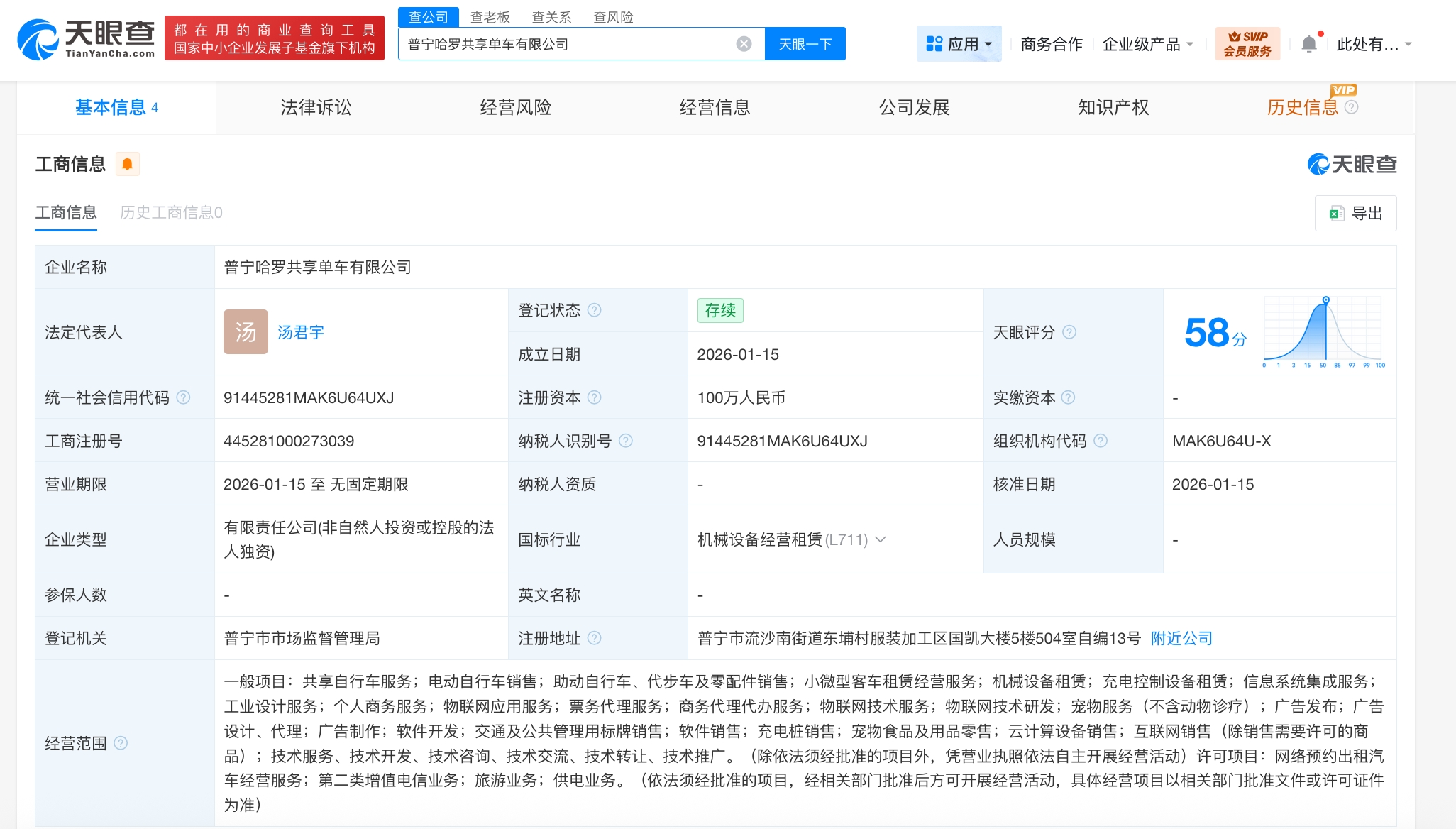 每经AI快讯,天眼查工商信息显示,近日,普宁哈罗共享单车有限公司成立,法定代表人为汤君宇,注册资本100万元人民币,经营范围含共享自行车服务、电动自行车销售、小微型客车租赁经营服务、个人商务服务、物联网应用服务、票务代理服务、商务代理代办服务等。股东信息显示,该公司由哈啰出行关联公司上海哈啰普惠科技有限公司全资持股。