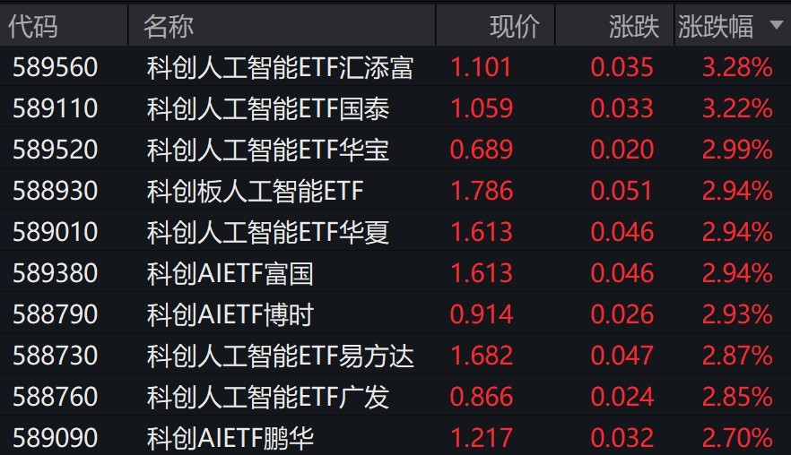 受盘面影响,科创人工智能相关ETF涨约3%。