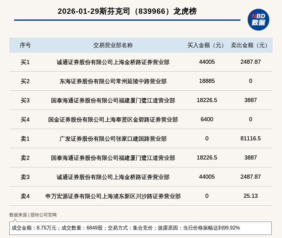 每经讯,2026年1月29日,新三板基础层公司斯芬克司(839966,收盘价:25.13元)登上龙虎榜,交易方式是集合竞价,披露原因是当日价格振幅达到99.92%,成交数量6849股,成交金额8.75万元。买一席位为诚通证券股份有限公司上海金桥路证券营业部,买入4.4万元;卖一席位为广发证券股份有限公司张家口建国路营业部,卖出8.11万元。