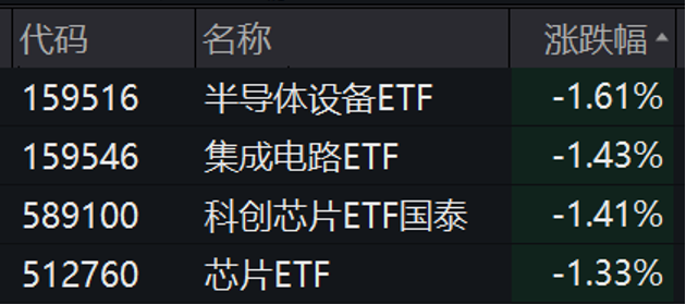 3月12日,半导体板块再度下跌,其中半导体设备ETF收跌1.61%,集成电路ETF下跌1.43%,科创芯片ETF下跌1.41%,芯片ETF下跌1.33%。