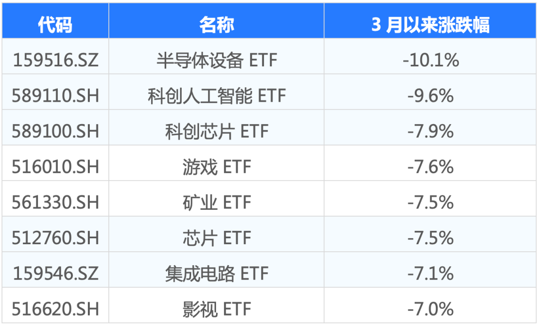 3月以来,受地缘政治冲突影响,成长板块整体承压,其中尤以半导体下滑明显。3月以来半导体设备ETF(159516)下跌10.1%,科创人工智能ETF(589110)下跌9.6%,科创芯片ETF(589100)下跌7.9%,芯片ETF(512760)下跌7.5%,集成电路ETF(159546)下跌7.1%。在所有成长板块中,半导体板块是下跌较为剧烈的品种。